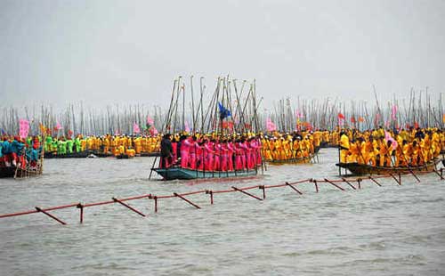 溱潼會船歷史悠久,歷經數百年傳承而不衰,被列入全國十大民俗節慶活動,被譽為“民俗文化之大觀、水鄉風情之博覽”。每年清明節后,四鄉八鎮的上千船只、上萬船民來此集會,十里溱湖,千舟齊發,萬篙爭流,場面十分壯觀,被譽為“世界最大水上廟會”。