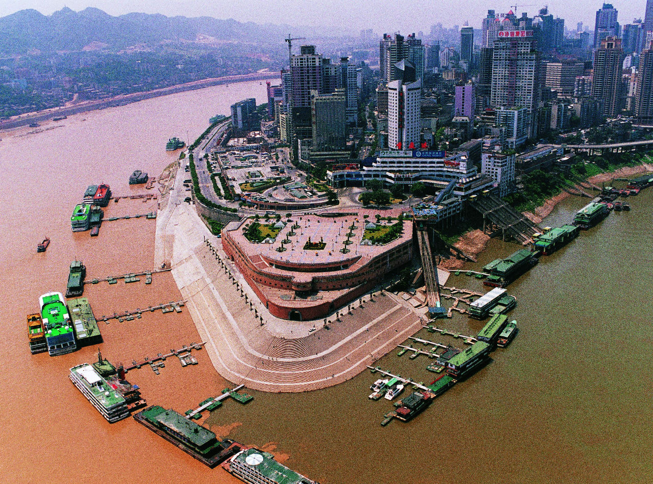 朝天門廣場就修建在碼頭的上面,遠(yuǎn)看朝天門廣場就象一艘揚(yáng)帆遠(yuǎn)航的巨輪,氣勢磅礴,因此朝天門廣場也被稱為重慶的泰坦尼克號。站在廣場上,可以看到兩江交匯,黃色的長江水與碧綠的嘉陵江水在交匯處涇渭分明,形成了一道獨(dú)特的景觀。伴隨西部大開發(fā),重慶大發(fā)展的力度加大,以朝天門為中心的區(qū)域正在經(jīng)歷一場華麗的巨變。為了搶占兩江匯合的絕佳景色,緊挨著朝天門而建的地標(biāo)性建筑猶如雨后春筍一般冒了出來。首先是南濱路,然后是重慶大劇院,再后是洪崖洞,現(xiàn)在是喜來登大酒店。在經(jīng)歷了這場巨變之后,朝天門廣場漸漸成為了配角。孰知,這絲毫沒有減緩朝天門的人潮涌動,反而加劇了這一現(xiàn)象。過去人們來重慶看朝天門,現(xiàn)在人們來朝天門看山城。所以江吹風(fēng)看山城是其最大特色。