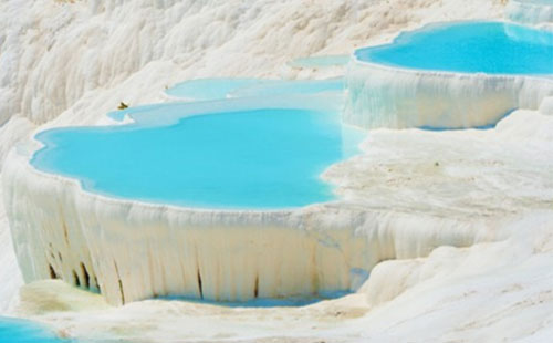 棉花堡是去土耳其旅游的必去景點。棉花堡位于土耳其登尼資里市的北部,是遠近聞名的溫泉度假勝地,此地不僅有上千年的天然溫泉,更有這種古怪的好似棉花一樣的山丘。土耳其文Pamuk表示棉花,Kale表示城堡,所以Pamukkale就叫棉花堡。棉花堡的得名既來源于一個傳說,也來自于它獨特的地貌特征:位于紡織工業重鎮代尼茲利的棉花堡地區,有豐富的溫泉資源,富含碳酸鈣的溫泉水不斷從地底涌出,再從丘陵上沿邊緣瀉下,流經之處在歷經一萬多年的鈣化沉淀后,形成了層層相疊的半圓形白色天然階梯,如城堡般堆積起來,遠看又似棉花團般蓬松。