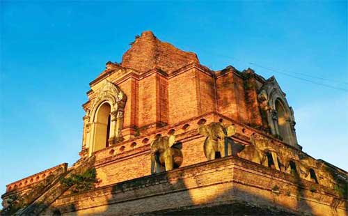 寺內有一座宏大的四方形佛塔,始建于15世紀初,以后數次增建,高達85.4米,據說可遠望千里。1545年清邁發生一次大地震和大風災,佛塔的尖頂一夜之間塌毀,露出塔內的金身佛像。塔的南側有6個象頭雕像,其中5個都是后來用水泥修復的贗品,只有最右邊用磚頭砌成的是真品。可惜的是,經年的風吹日曬使鼻子和耳朵都損壞了。圍繞著四方形佛塔走,在四方形佛塔的后面有兩座殿堂。在每座殿堂中間的玻璃櫥中端坐著身披迦裟的高僧的蠟像,目光炯炯,栩栩如生。看完契迪龍寺介紹,和重慶旅行社的小編一起來詳細了解下契迪龍寺門票及開放時間、契迪龍寺地址及契迪龍寺游覽提示。