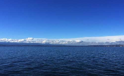 日內(nèi)瓦湖的兩岸氣候溫和,四季宜人。湖水、雪山和藍(lán)天連成一片,成千上萬的水鴨在湖面翱翔,雪白的天鵝在水中游弋。游艇和彩色帆游弋湖中,成群白鴿在湖畔倘佯,和平寧靜。