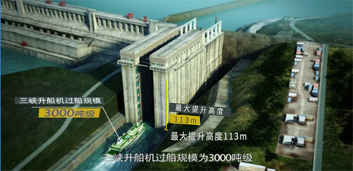 三峽游輪噸位重,船身大,通過三峽大壩所需時間極長,而三峽升船機的修建,則最大程度上的改善了這一難點。上游通航水位變幅大,當船舶駛?cè)氤写瑤P閉承船廂下游閘門,承船廂通過爬升裝置上升,直到承船廂內(nèi)水位與上游水庫水位齊平時,打開承船廂上游閘門,船舶駛出承船廂進入上游航道。船舶從上游向下游行駛,與其過程相反,因下游水位變化速率快,就像乘坐“大腳盆”電梯一樣,只需約40分鐘,3000噸級船舶就可以完成近40層樓房高度的垂直升降,通俗的講就是輪船坐“電梯”上上下下過大壩。